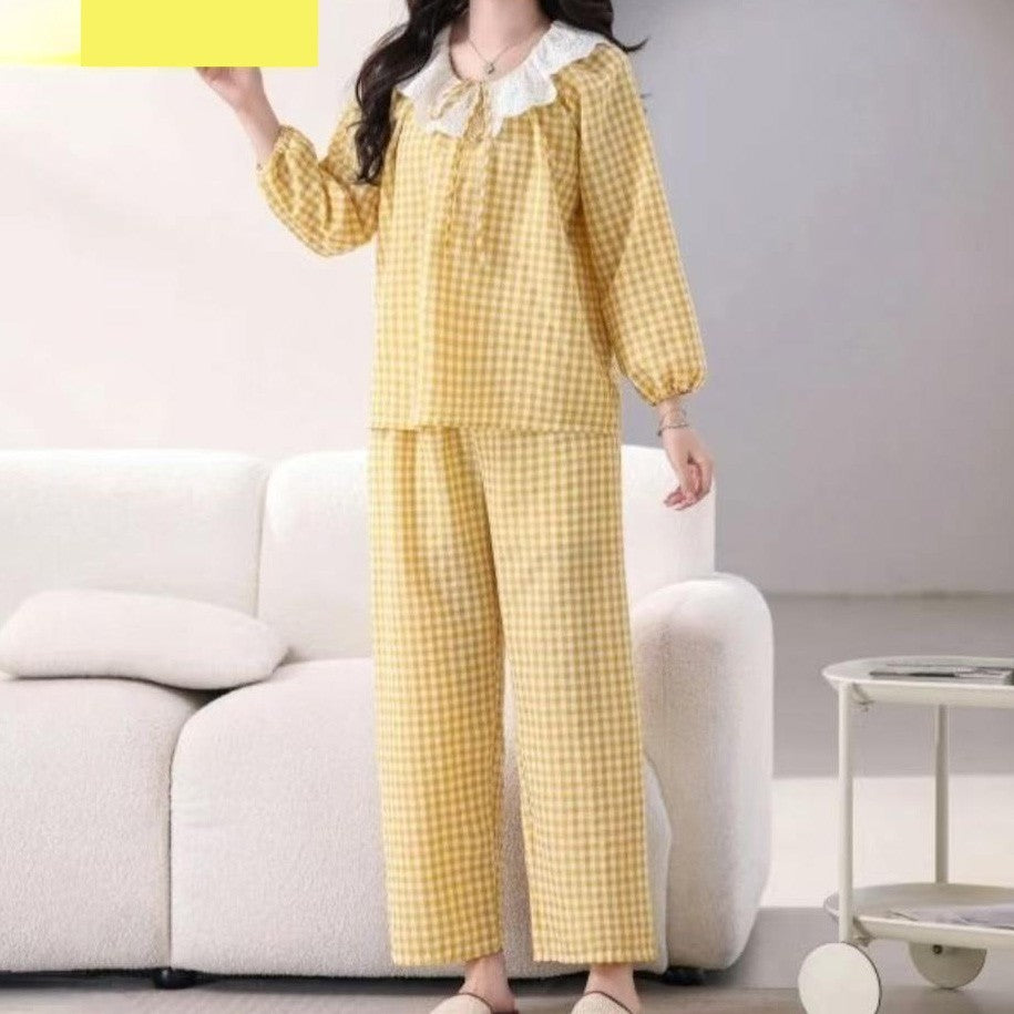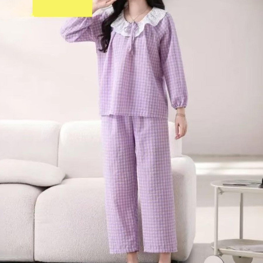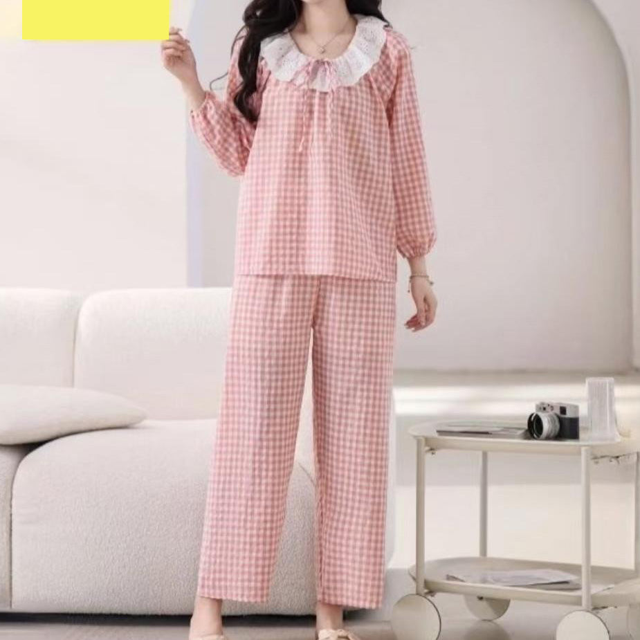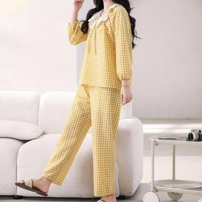 zp590-Bowknot lace plaid loose and comfortable women's pajamas and pants set