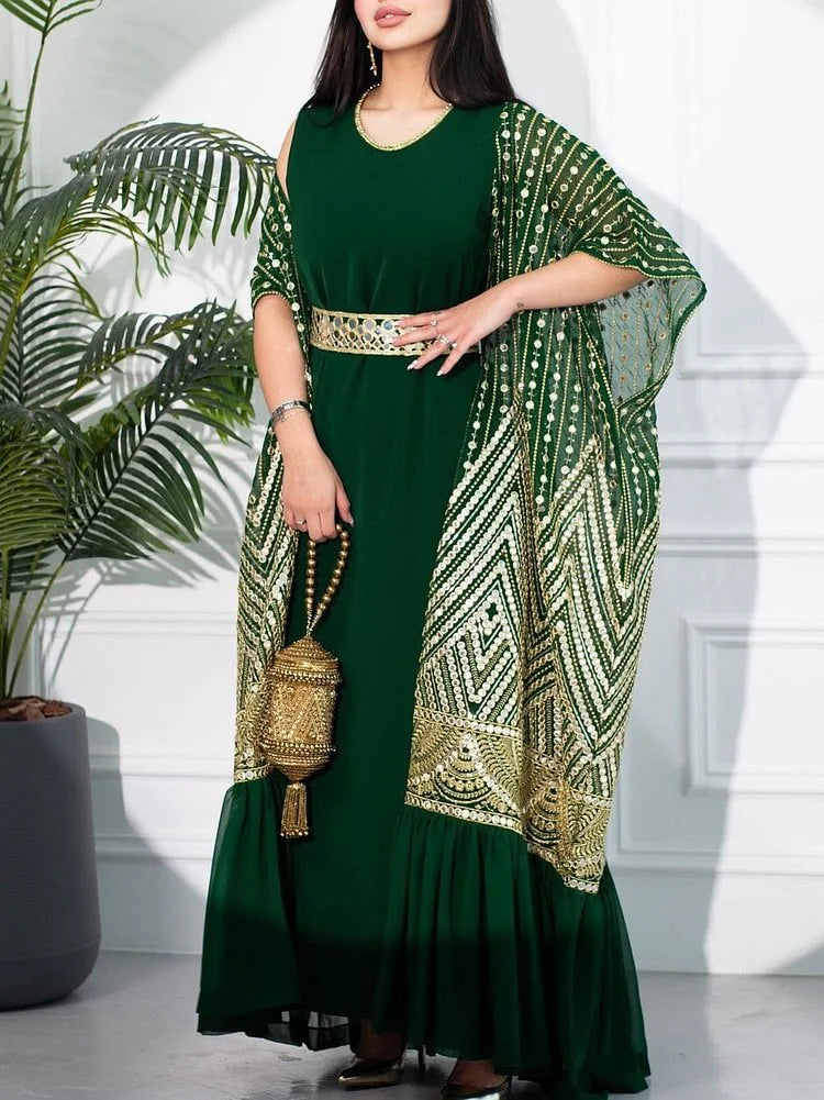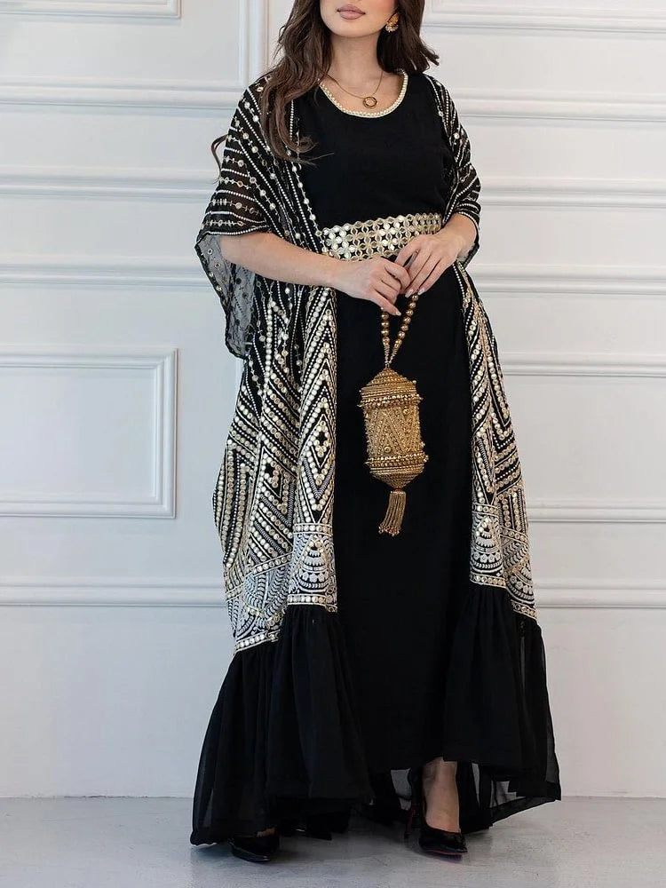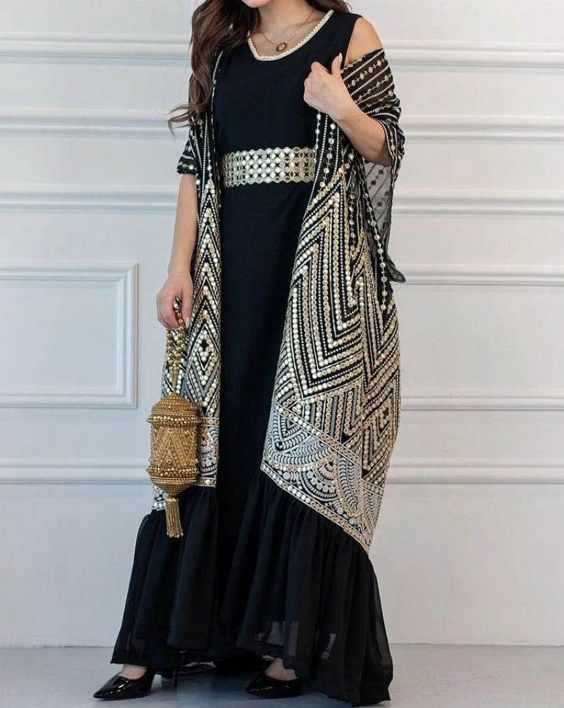 نقدم لكم فستانًا أنيقًا وأنيقًا ومجموعة تونيك! يتميز الفستان بياقة دائرية ومزين بالترتر اللافت للنظر لإضفاء لمسة من التألق. تم تصميم التونيك بنفس تفاصيل الترتر الأنيقة، مما يرفع المجموعة بأكملها إلى مستوى جديد من الرقي. مثالية للمناسبات الخاصة أو الخروج ليلاً، ومن المؤكد أن هذه المجموعة ستجعلك مركز الاهتمام.