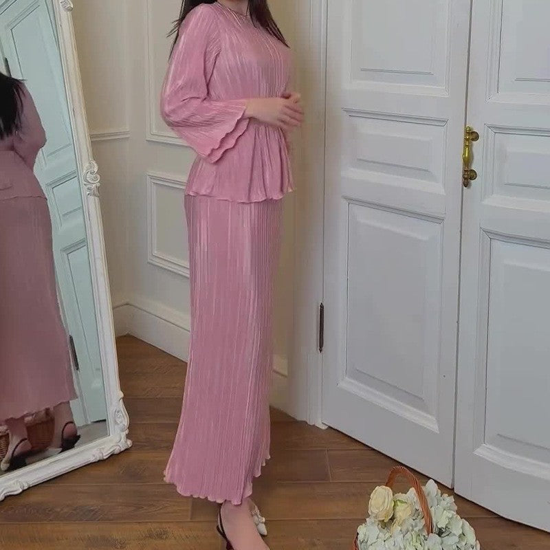 بدلة تنورة قصيرة ذات لون سادة برقبة دائرية مخططة للنساء
