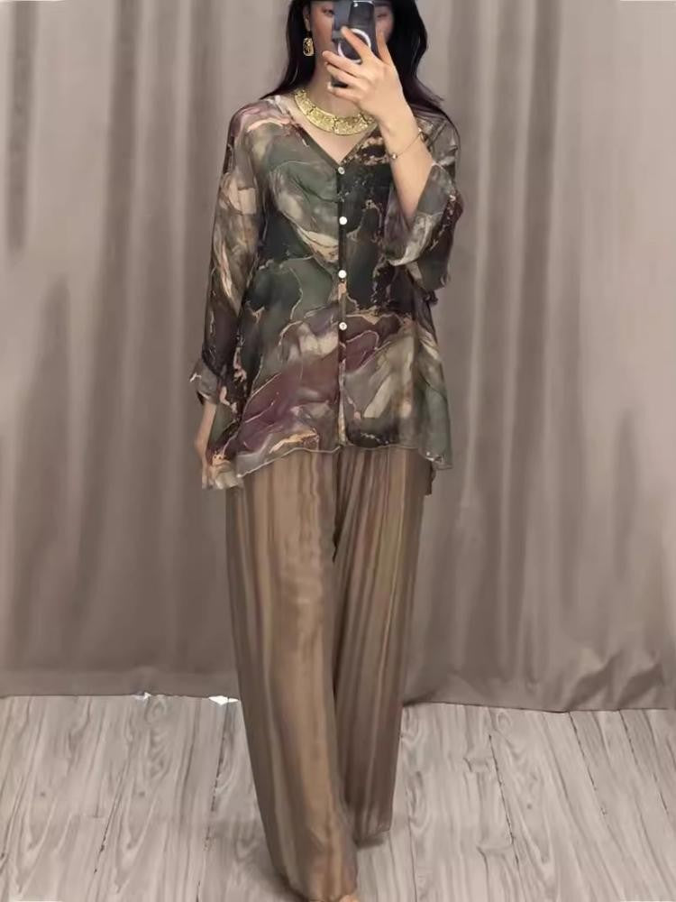 ae661-2024 European and American spring fashion new hand-painted printed shirt top wide-leg pants two-piece set