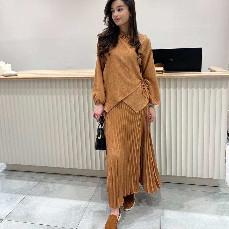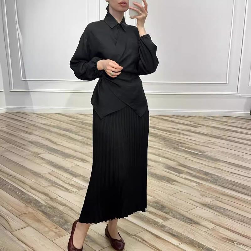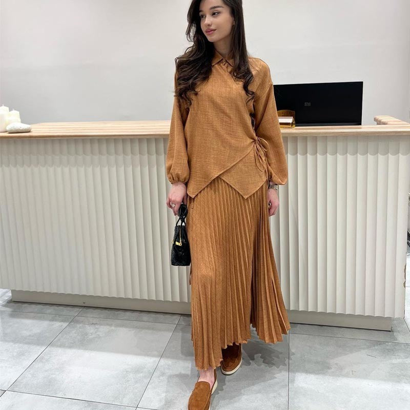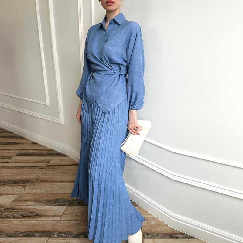 قميص أنيق برباط وتنورة مطوية بدلة كاجوال مكونة من قطعتين