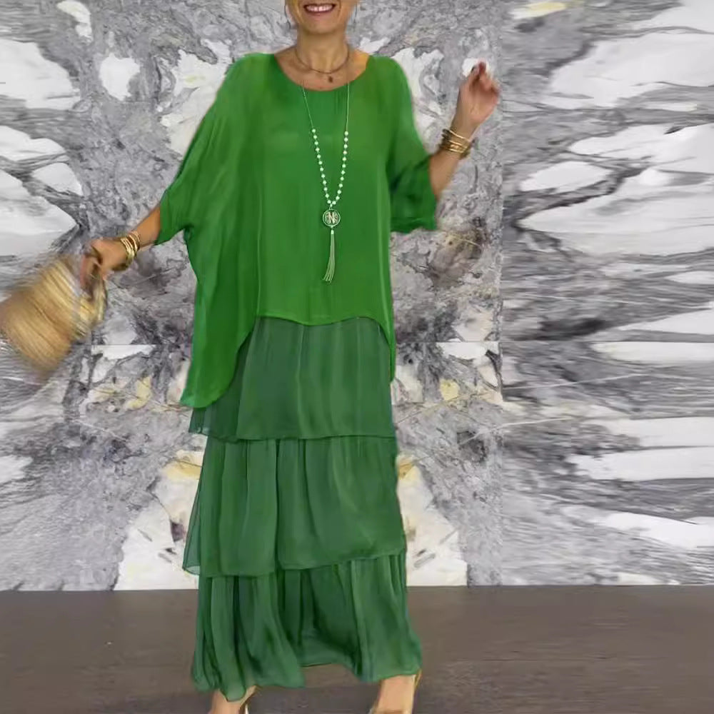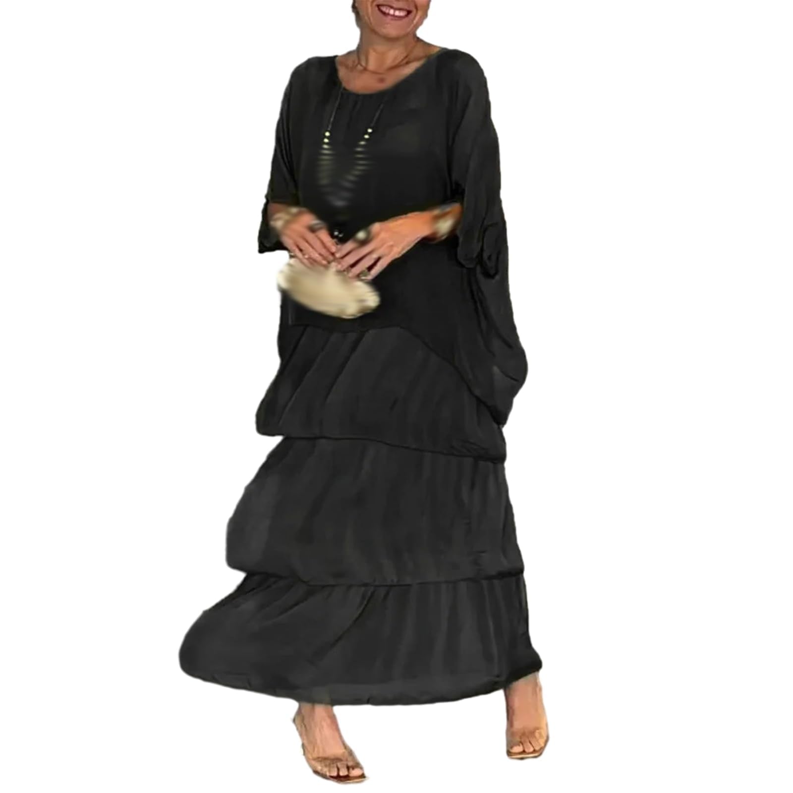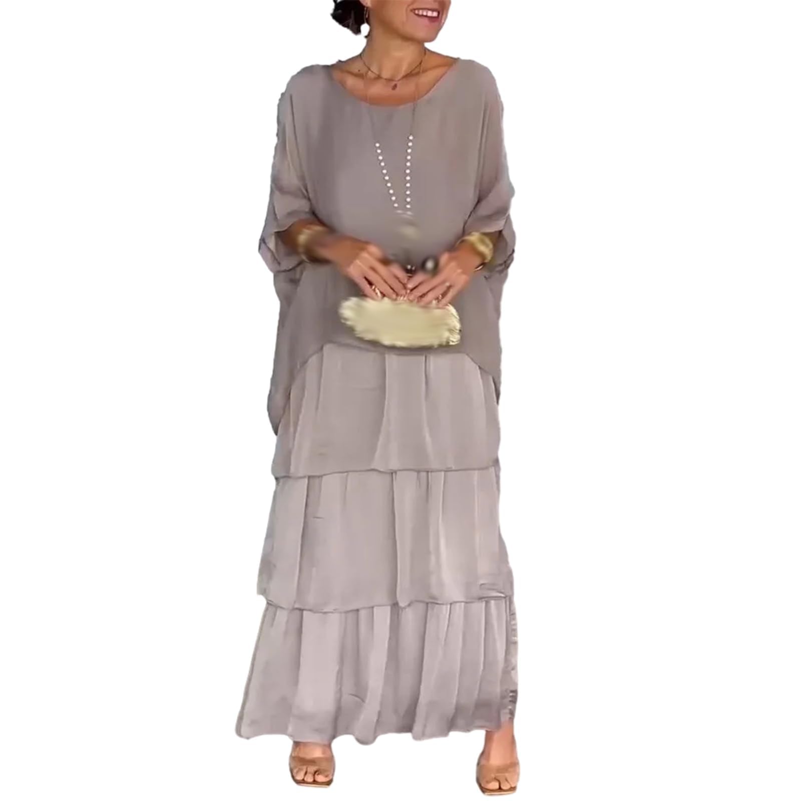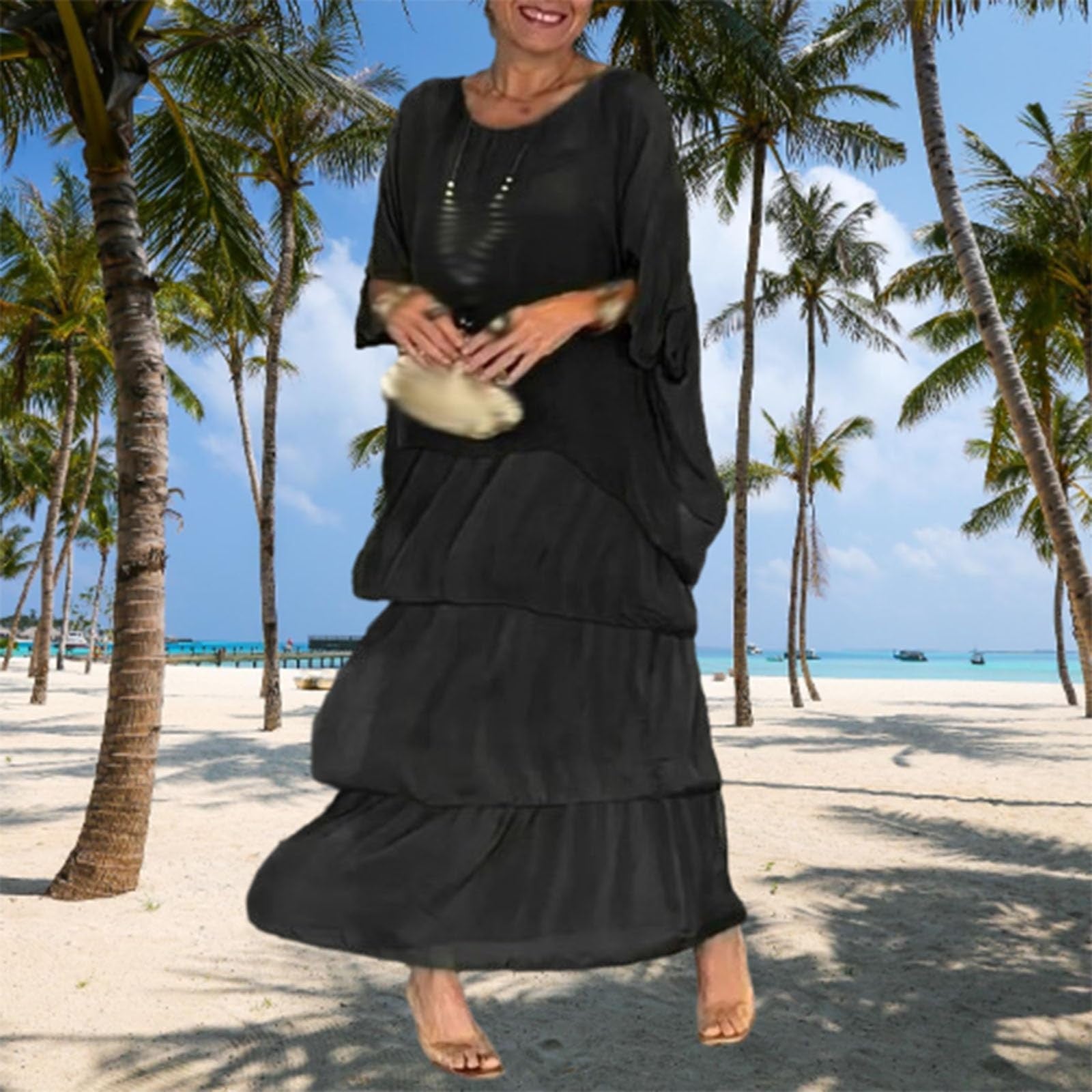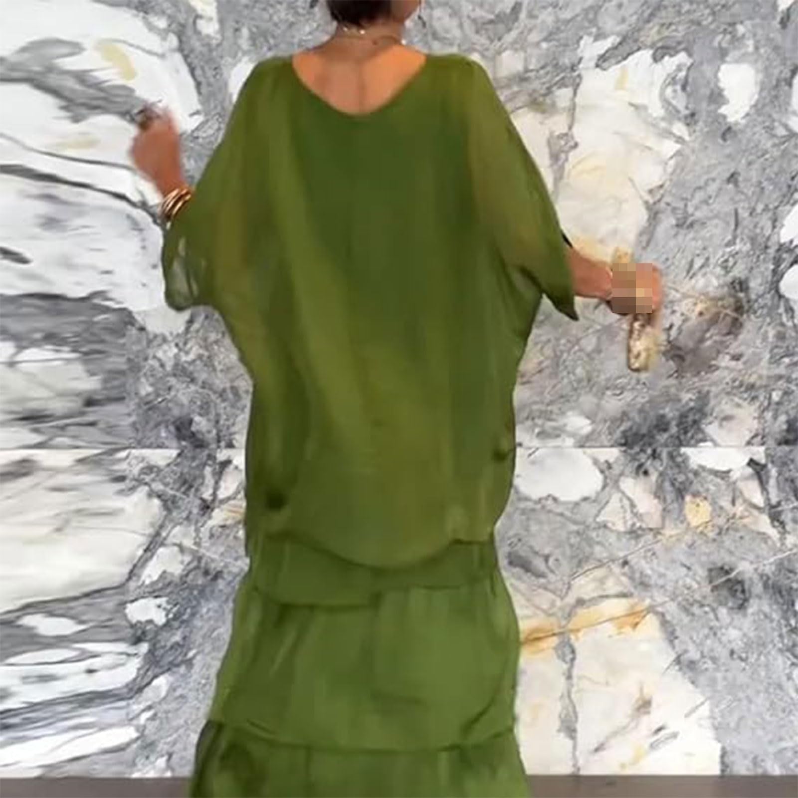 2024 European and American fashion new chiffon mesh bat sleeve round neck long dress